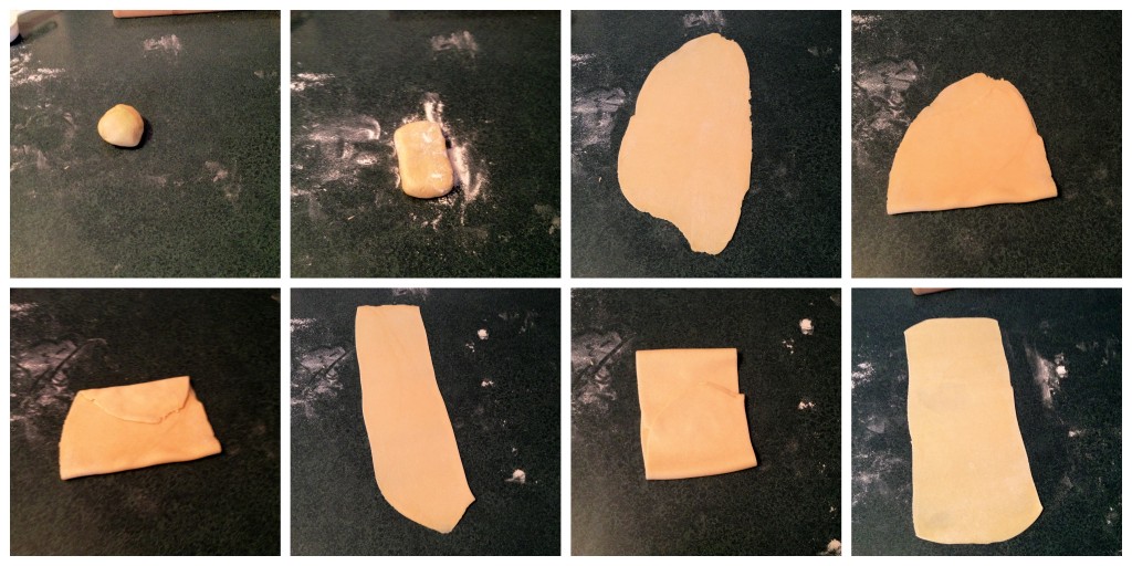 - Roll it out into a nice flat, long shape and then fold it in thirds so that two of the rectangle’s edges are smooth. Now turn the rough edges so they’re on the side closet to you and furthest from you. Roll it out again into a long shape and then fold it into thirds again so that you have an entirely smooth rectangle. Roll out the dough one more time as flat and long as you can possible get it. If you have a pasta machine, ignore all these directions and do your thing, you lucky dog.