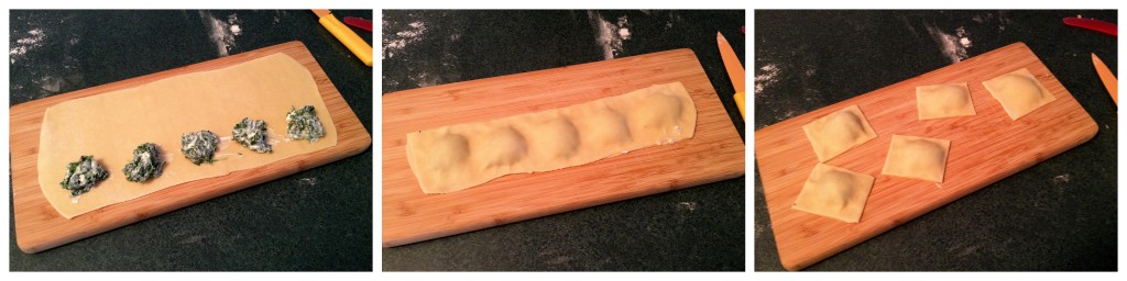- Drop 5 or so small dollops of filling along one side of the dough and then fold the other side over. Use your fingers to seal around the edges of each dollop and then slice your ravioli apart with a knife. Sometimes some spinach tries to escape, so go around the sides of each piece of ravioli and pinch the sides closed as tightly as possible. Put the ravioli in an airtight container and repeat with the other 7 pieces of dough.