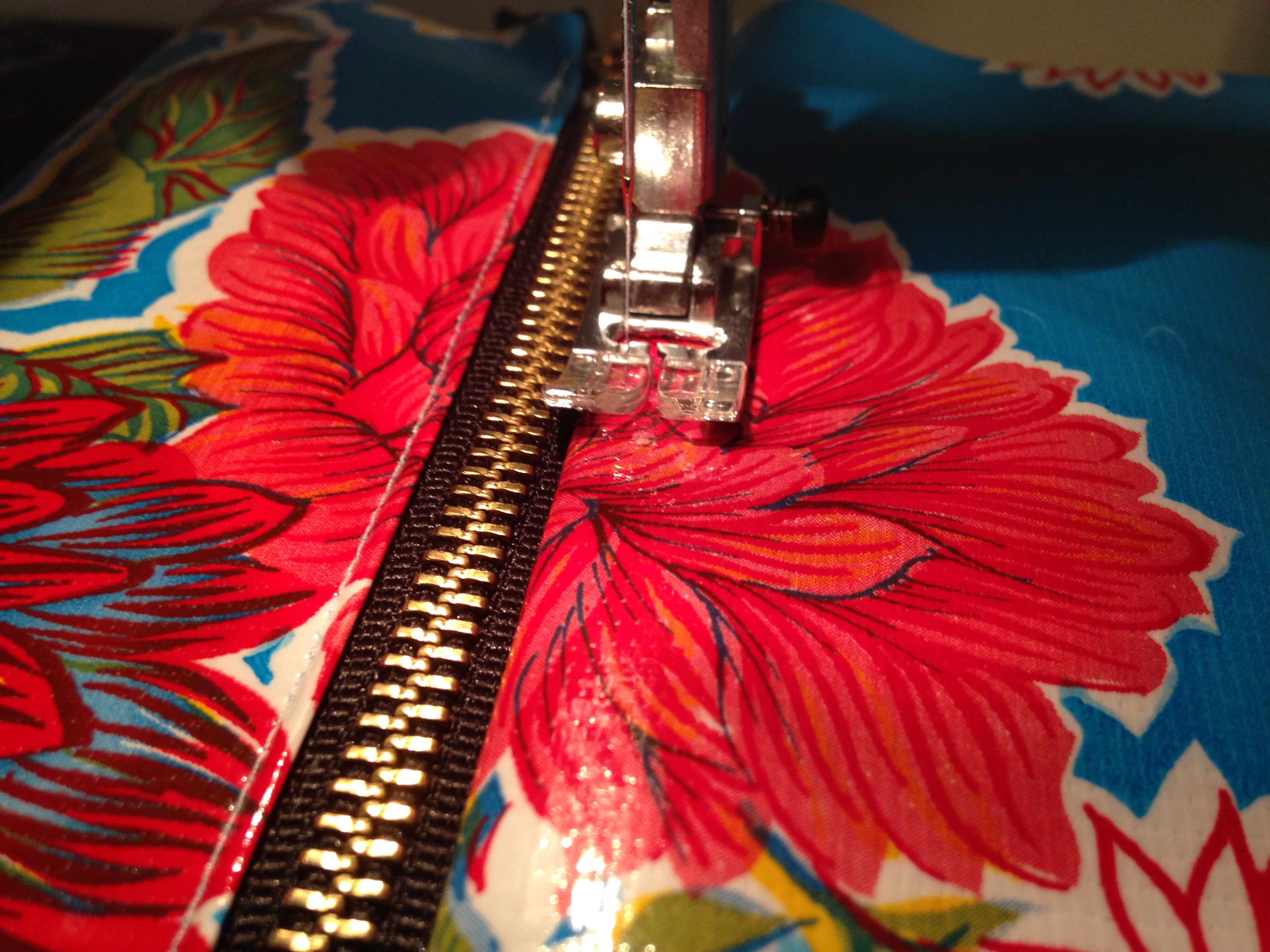 - Fold the oilcloth over so that the pretty side is showing and stitch along the zipper so that the fold stays in place.