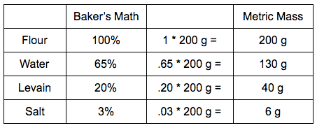 Now that you know how to translate a baker’s math recipe into a mass recipe, let’s go backwards. This is a good skill to have when you’re trying a new recipe and want to compare it to ones you’ve baked before or when you need to increase or decrease the size of the loaf you’re making. To convert, simply divide each ingredient mass by flour mass (910 g).