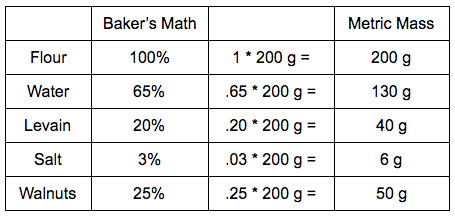 Or maybe you decide it needs something extra: walnuts. After a little research, you notice that lots of recipes for walnut bread call for walnuts at 15% to 30%. This gives you a guideline that’ll let you do a little bit of guessing for this experimental loaf. Let’s say you settle on 25%. To find out how many walnuts you’ll need, just multiply the flour mass (200 g) by 25% (.25).