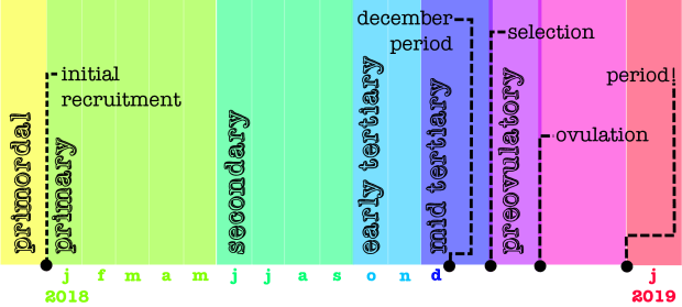 This is folliculogenesis in a nutshell! A class of primordial follicles are recruited every month and become primary follicles. Primary follicles’ only job is to rest and grow. Those that don’t do their job well enough die off in a process called artresia. The remaining follicles are called secondary which keep growing and dying off. The follicles that make it through the secondary stage grow a sac and are called tertiary. They start growing faster and dying off faster until only one follicle remains. After a year of growth, this pre-ovulatory follicle takes a week to mature fully and then releases its egg during ovulation.