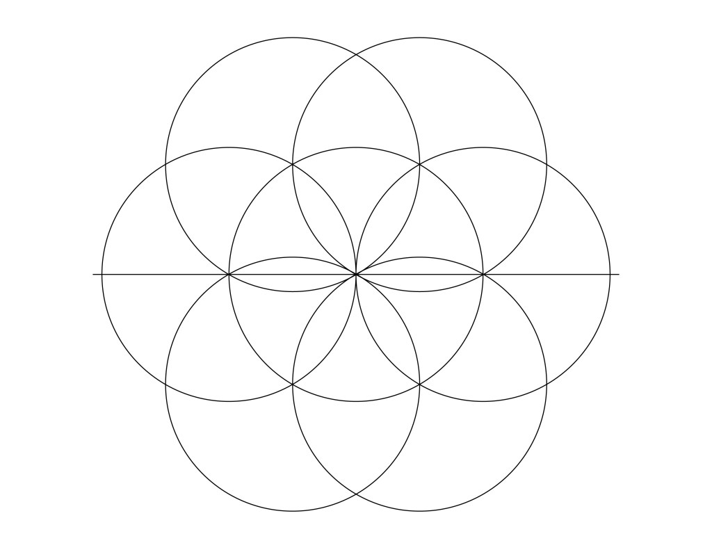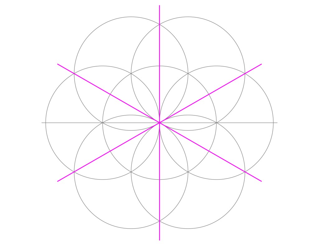 2. Draw three lines through the six large petals outside the mother circle. You will end up with one vertical and two diagonal mirror lines.