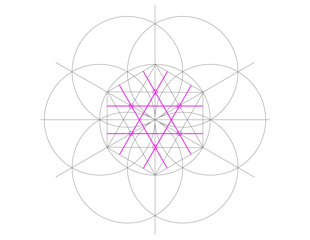 3. Finding the points where the mirror lines intersect with the mother circle, draw a dynamic hexagon. A dynamic hexagon is balanced on one of the points and looks like it might topple over at any minute.